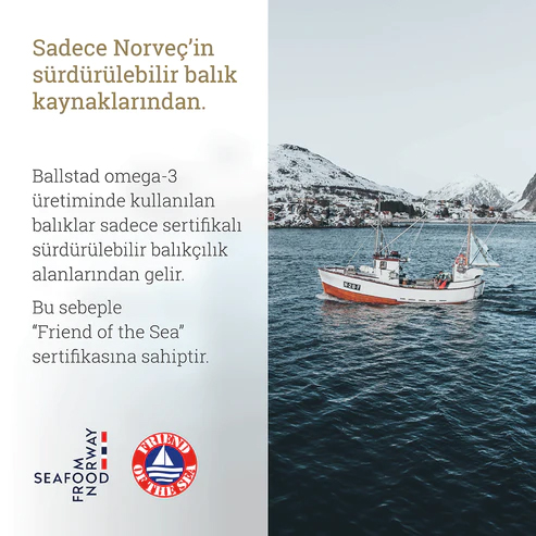 Ballstad’ın Premium Balık Yağı kapsülleri şeker, glüten, tatlandırıcı, renklendirici ve trans yağ içermez. Doğal sürdürülebilir balıkçılık alanlarında elde edilen balıklar kullanılır.